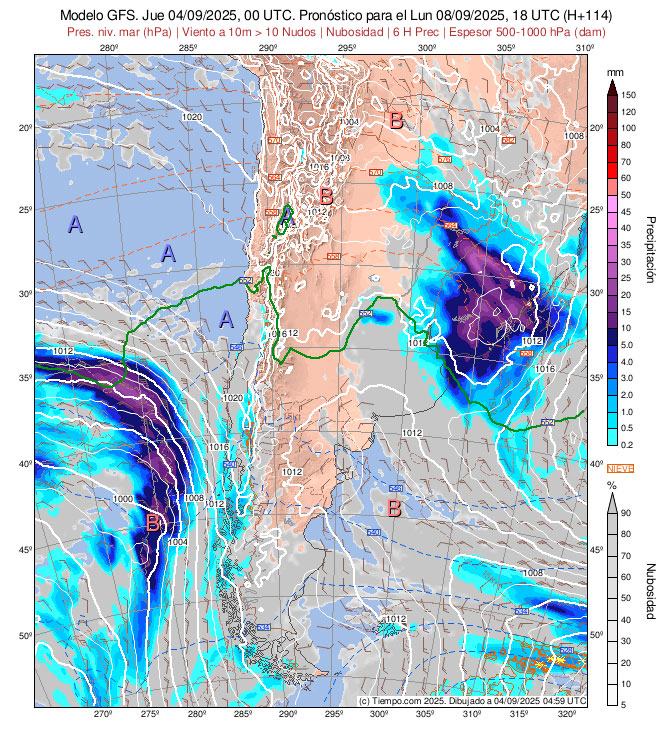Presentan las Isobaras de la Carta de Superficie (con isobaras trazadas cada 2 hPa),  la Carta de Espesores 500/1000 hPa, algunos vientos ploteados, áreas de Lluvias y de Nubosidad previstas.