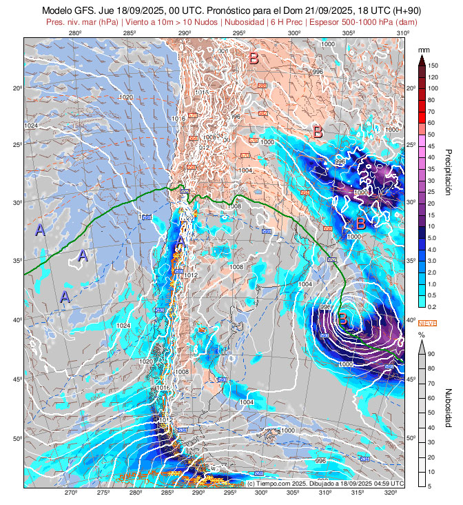 Presentan las Isobaras de la Carta de Superficie (con isobaras trazadas cada 2 hPa),  la Carta de Espesores 500/1000 hPa, algunos vientos ploteados, áreas de Lluvias y de Nubosidad previstas.