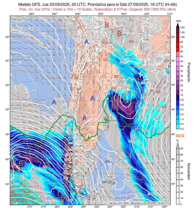 Presentan las Isobaras de la Carta de Superficie (con isobaras trazadas cada 2 hPa),  la Carta de Espesores 500/1000 hPa, algunos vientos ploteados, áreas de Lluvias y de Nubosidad previstas.