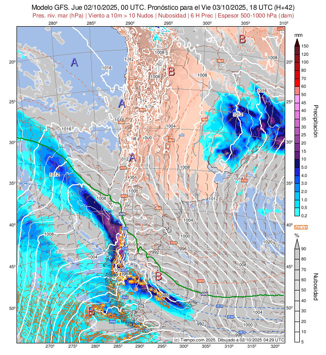 Presentan las Isobaras de la Carta de Superficie (con isobaras trazadas cada 2 hPa),  la Carta de Espesores 500/1000 hPa, algunos vientos ploteados, áreas de Lluvias y de Nubosidad previstas.