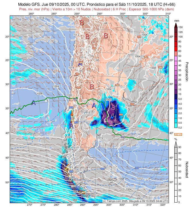 Presentan las Isobaras de la Carta de Superficie (con isobaras trazadas cada 2 hPa),  la Carta de Espesores 500/1000 hPa, algunos vientos ploteados, áreas de Lluvias y de Nubosidad previstas.