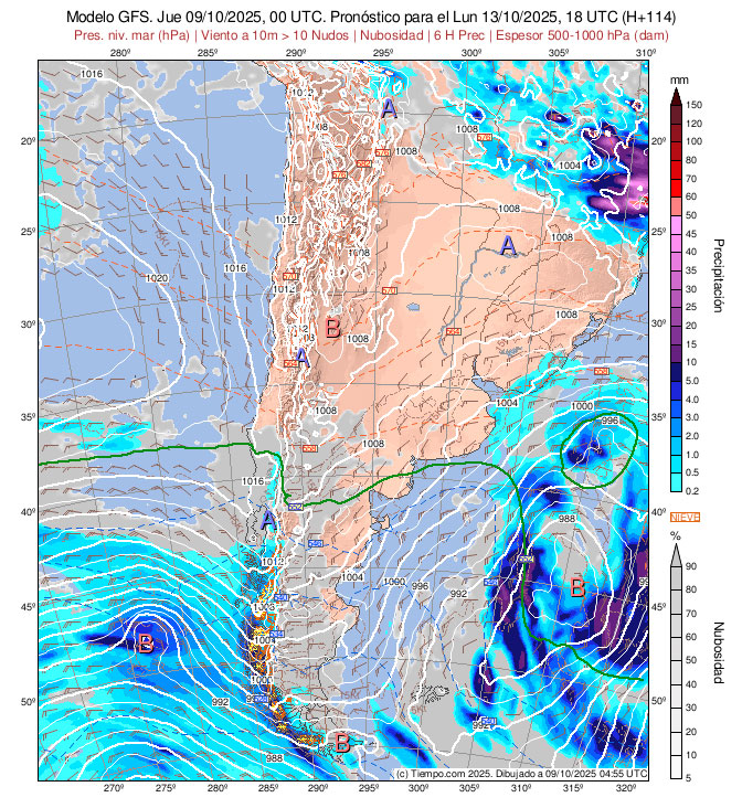 Presentan las Isobaras de la Carta de Superficie (con isobaras trazadas cada 2 hPa),  la Carta de Espesores 500/1000 hPa, algunos vientos ploteados, áreas de Lluvias y de Nubosidad previstas.