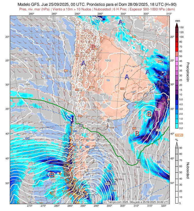 Presentan las Isobaras de la Carta de Superficie (con isobaras trazadas cada 2 hPa),  la Carta de Espesores 500/1000 hPa, algunos vientos ploteados, áreas de Lluvias y de Nubosidad previstas.
