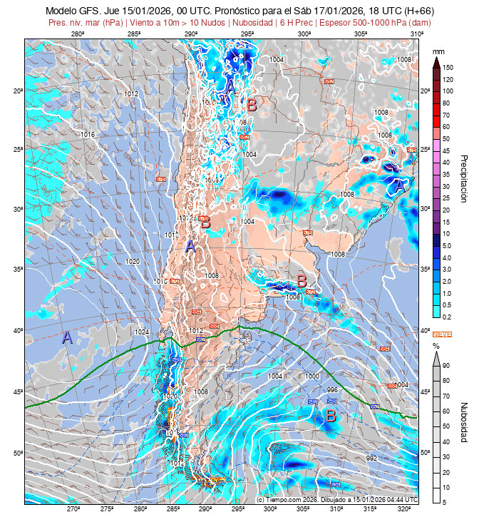 la Carta de Espesores 500/1000 hPa, algunos vientos ploteados, áreas
