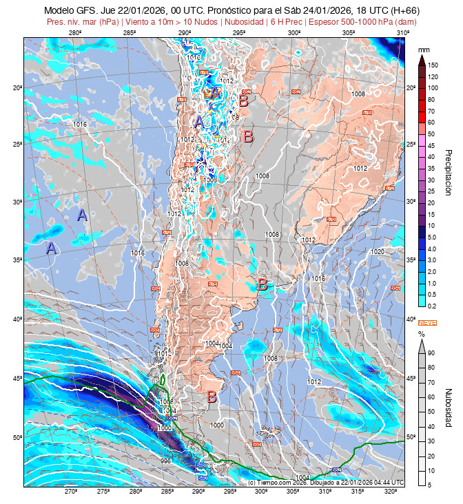 Presentan las Isobaras de la Carta de Superficie (con isobaras trazadas cada 2 hPa),  la Carta de Espesores 500/1000 hPa, algunos vientos ploteados, áreas de Lluvias y de Nubosidad previstas.