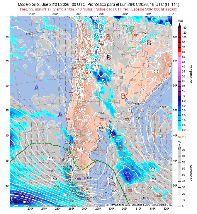 Presentan las Isobaras de la Carta de Superficie (con isobaras trazadas cada 2 hPa),  la Carta de Espesores 500/1000 hPa, algunos vientos ploteados, áreas de Lluvias y de Nubosidad previstas.