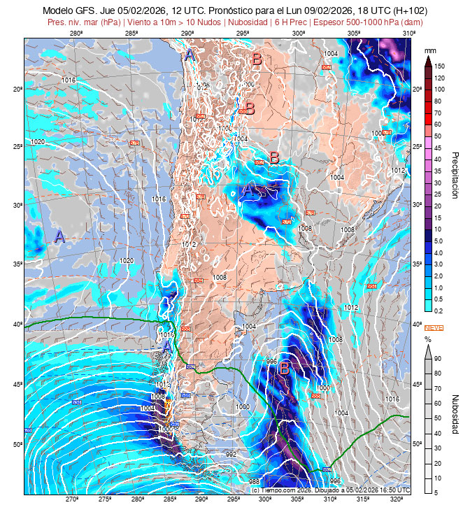 Presentan las Isobaras de la Carta de Superficie (con isobaras trazadas cada 2 hPa),  la Carta de Espesores 500/1000 hPa, algunos vientos ploteados, áreas de Lluvias y de Nubosidad previstas.