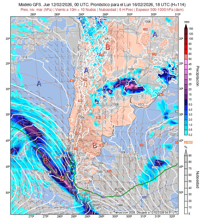 Presentan las Isobaras de la Carta de Superficie (con isobaras trazadas cada 2 hPa),  la Carta de Espesores 500/1000 hPa, algunos vientos ploteados, áreas de Lluvias y de Nubosidad previstas.