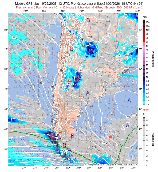 Presentan las Isobaras de la Carta de Superficie (con isobaras trazadas cada 2 hPa),  la Carta de Espesores 500/1000 hPa, algunos vientos ploteados, áreas de Lluvias y de Nubosidad previstas.