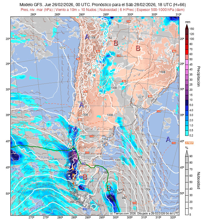 Presentan las Isobaras de la Carta de Superficie (con isobaras trazadas cada 2 hPa),  la Carta de Espesores 500/1000 hPa, algunos vientos ploteados, áreas de Lluvias y de Nubosidad previstas.
