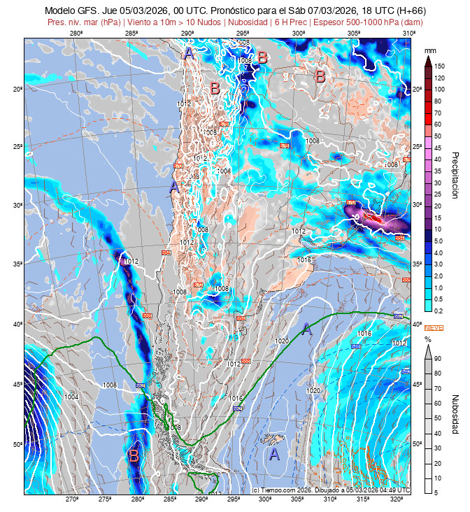 Presentan las Isobaras de la Carta de Superficie (con isobaras trazadas cada 2 hPa),  la Carta de Espesores 500/1000 hPa, algunos vientos ploteados, áreas de Lluvias y de Nubosidad previstas.