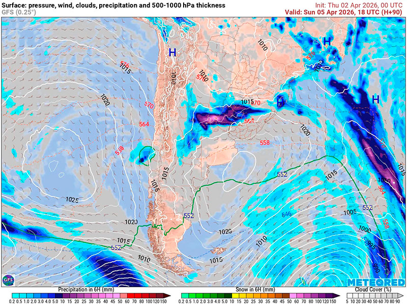 Presentan las Isobaras de la Carta de Superficie (con isobaras trazadas cada 2 hPa),  la Carta de Espesores 500/1000 hPa, algunos vientos ploteados, áreas de Lluvias y de Nubosidad previstas.