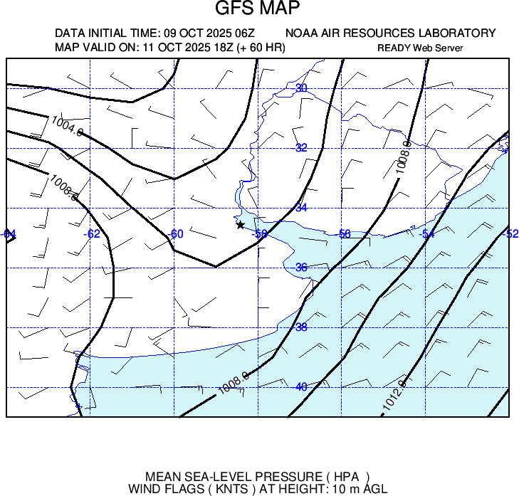 Ploteo de vientos En las cartas adjuntas los vientos se encuentran ploteados, facilitando la lectura de la dirección e intensidad. La dirección graficada con una barra indica desde donde viene el viento, uno de los extremos tiene un pequeño círculo que es el lugar de la observación y el otro extremo el cuadrante según la rosa de los vientos; de este último nacen las barbas que indican la intensidad del viento, para una barba larga 10 nudos, una corta 5 nudos y un triángulo 50. La sumatoria de ellas es la intensidad del viento previsto en Knt (nudos) o sea millas por hora. Para convertirlo a km/h se deberá utilizar la siguiente fórmula: 1kt = 1,852 km/h. Para hacer una cuenta rápida y obtener un valor aproximado, multiplicar por 2 y restar el 10%.