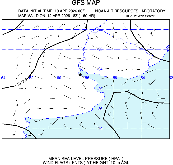 En las cartas adjuntas los vientos se encuentran ploteados, facilitando la lectura de la dirección e intensidad. La dirección graficada con una barra indica desde donde viene el viento, uno de los extremos tiene un pequeño círculo que es el lugar de la observación y el otro extremo el cuadrante según la rosa de los vientos; de este último nacen las barbas que indican la intensidad del viento, para una barba larga 10 nudos, una corta 5 nudos y un triángulo 50. La sumatoria de ellas es la intensidad del viento previsto en Knt (nudos) o sea millas por hora. Para convertirlo a km/h se deberá utilizar la siguiente fórmula: 1kt = 1,852 km/h. Para hacer una cuenta rápida y obtener un valor aproximado, multiplicar por 2 y restar el 10%.