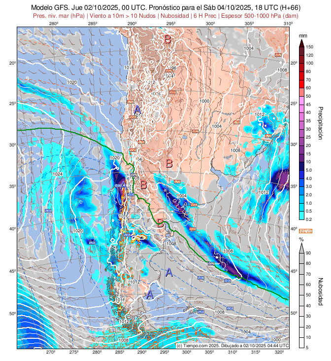 Presentan las Isobaras de la Carta de Superficie (con isobaras trazadas cada 2 hPa),  la Carta de Espesores 500/1000 hPa, algunos vientos ploteados, áreas de Lluvias y de Nubosidad previstas.