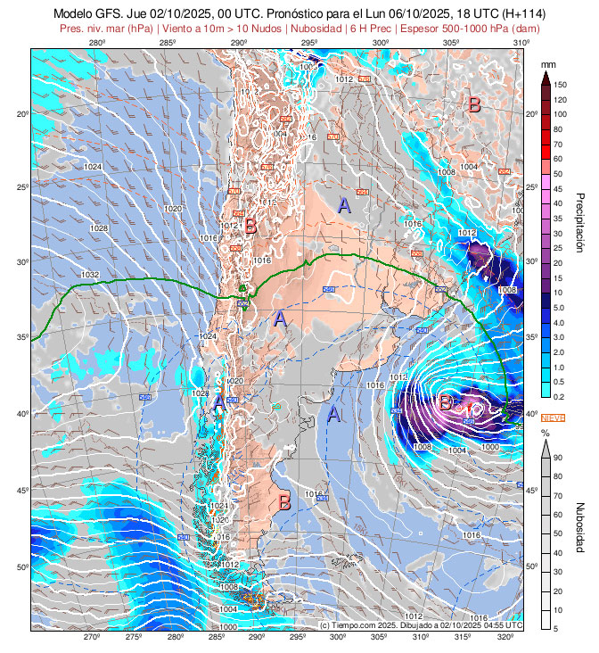 Presentan las Isobaras de la Carta de Superficie (con isobaras trazadas cada 2 hPa),  la Carta de Espesores 500/1000 hPa, algunos vientos ploteados, áreas de Lluvias y de Nubosidad previstas.