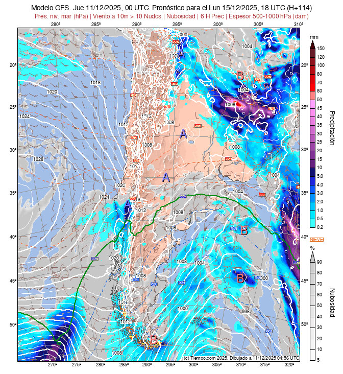 Presentan las Isobaras de la Carta de Superficie (con isobaras trazadas cada 2 hPa),  la Carta de Espesores 500/1000 hPa, algunos vientos ploteados, áreas de Lluvias y de Nubosidad previstas.