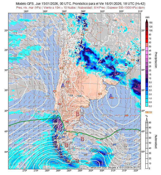 la Carta de Espesores 500/1000 hPa, algunos vientos ploteados, áreas