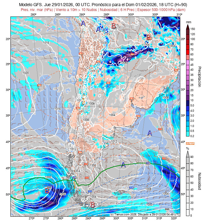 la Carta de Espesores 500/1000 hPa, algunos vientos ploteados, áreas