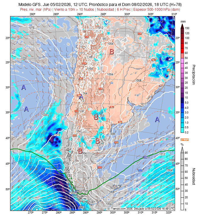 la Carta de Espesores 500/1000 hPa, algunos vientos ploteados, áreas