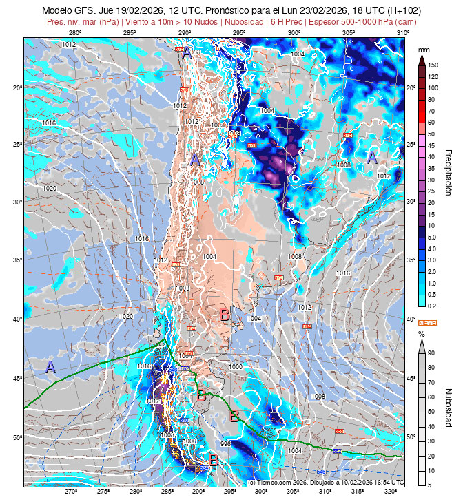Presentan las Isobaras de la Carta de Superficie (con isobaras trazadas cada 2 hPa),  la Carta de Espesores 500/1000 hPa, algunos vientos ploteados, áreas de Lluvias y de Nubosidad previstas.
