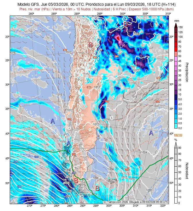 Presentan las Isobaras de la Carta de Superficie (con isobaras trazadas cada 2 hPa),  la Carta de Espesores 500/1000 hPa, algunos vientos ploteados, áreas de Lluvias y de Nubosidad previstas.