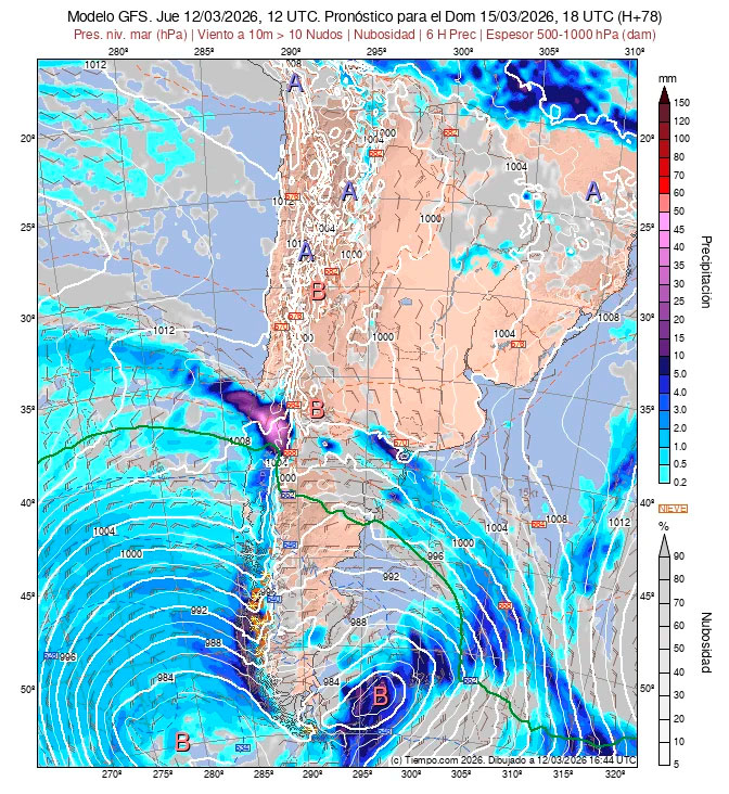 Presentan las Isobaras de la Carta de Superficie (con isobaras trazadas cada 2 hPa),  la Carta de Espesores 500/1000 hPa, algunos vientos ploteados, áreas de Lluvias y de Nubosidad previstas.