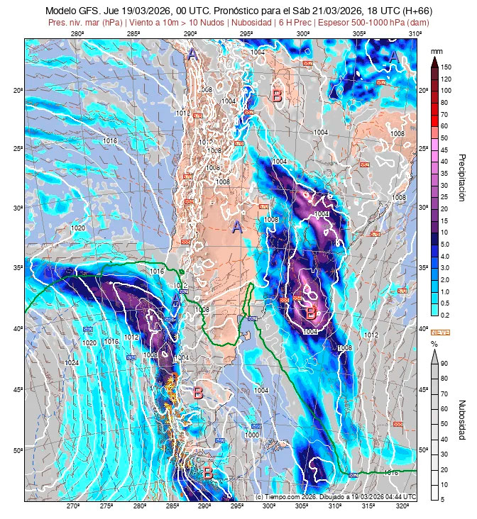 Presentan las Isobaras de la Carta de Superficie (con isobaras trazadas cada 2 hPa),  la Carta de Espesores 500/1000 hPa, algunos vientos ploteados, áreas de Lluvias y de Nubosidad previstas.