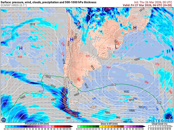 la Carta de Espesores 500/1000 hPa, algunos vientos ploteados, áreas