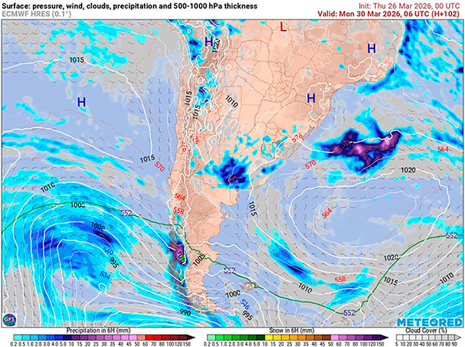 Presentan las Isobaras de la Carta de Superficie (con isobaras trazadas cada 2 hPa),  la Carta de Espesores 500/1000 hPa, algunos vientos ploteados, áreas de Lluvias y de Nubosidad previstas.