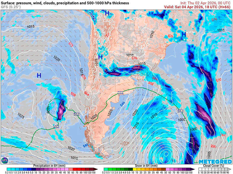 Presentan las Isobaras de la Carta de Superficie (con isobaras trazadas cada 2 hPa),  la Carta de Espesores 500/1000 hPa, algunos vientos ploteados, áreas de Lluvias y de Nubosidad previstas.