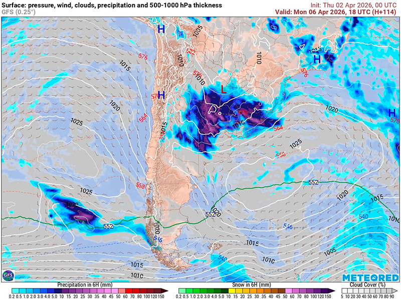 Presentan las Isobaras de la Carta de Superficie (con isobaras trazadas cada 2 hPa),  la Carta de Espesores 500/1000 hPa, algunos vientos ploteados, áreas de Lluvias y de Nubosidad previstas.