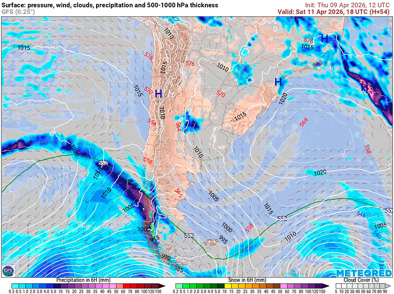 la Carta de Espesores 500/1000 hPa, algunos vientos ploteados, áreas