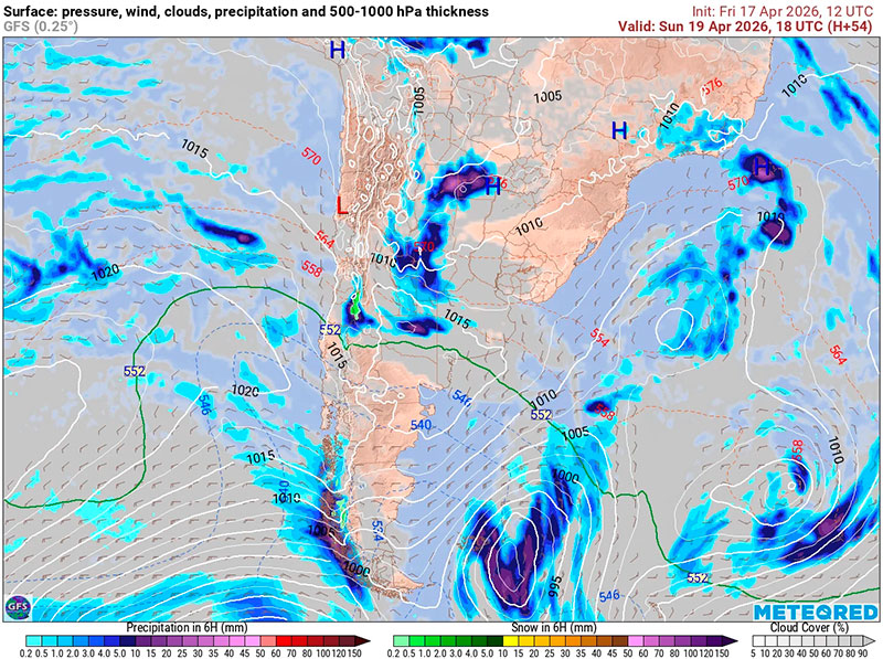 la Carta de Espesores 500/1000 hPa, algunos vientos ploteados, áreas