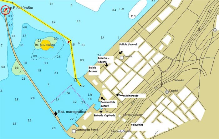 A pocos metros hay una estación de combustibles sin marca registrada y desaconsejada por los nautas locales. Adjunto las ayudas a la navegación: A continuación los tracks para Garmin (gdb ) , GPS, MapSource y nRoute, y el track para OziExplorer (plt). 2011-03-04_194042_Acceso_Terminal_Nautica_Salvador_Garmin.zi p 2011-03-04_194111_Acceso_Terminal_Nautica_Salvador__Ozi.zip Plano