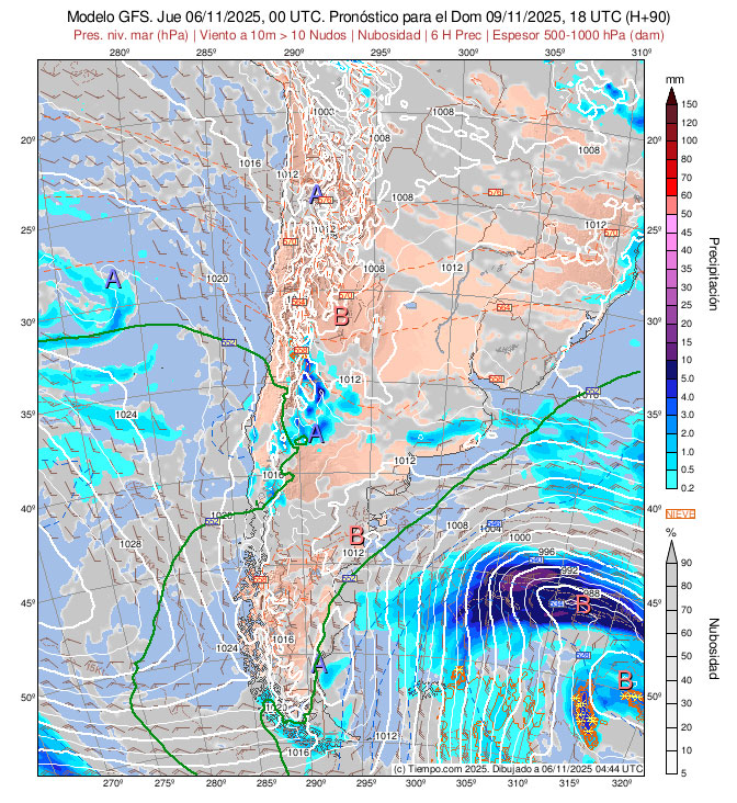 Presentan las Isobaras de la Carta de Superficie (con isobaras trazadas cada 2 hPa),  la Carta de Espesores 500/1000 hPa, algunos vientos ploteados, áreas de Lluvias y de Nubosidad previstas.
