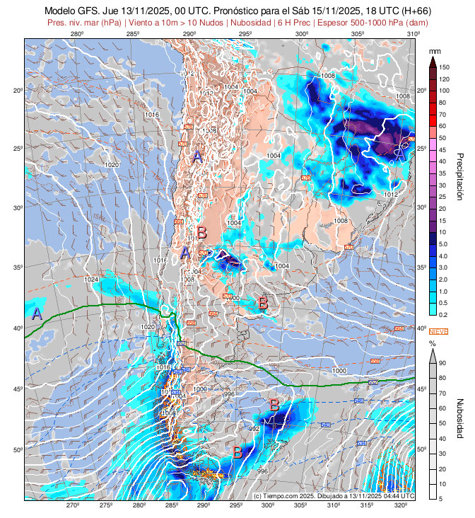 Presentan las Isobaras de la Carta de Superficie (con isobaras trazadas cada 2 hPa),  la Carta de Espesores 500/1000 hPa, algunos vientos ploteados, áreas de Lluvias y de Nubosidad previstas.
