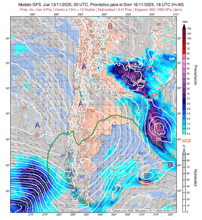 Presentan las Isobaras de la Carta de Superficie (con isobaras trazadas cada 2 hPa),  la Carta de Espesores 500/1000 hPa, algunos vientos ploteados, áreas de Lluvias y de Nubosidad previstas.