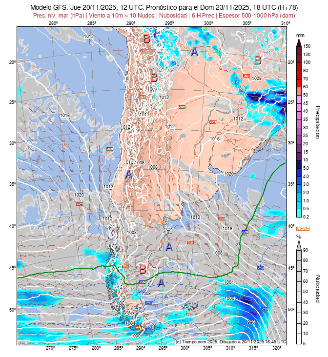 Presentan las Isobaras de la Carta de Superficie (con isobaras trazadas cada 2 hPa),  la Carta de Espesores 500/1000 hPa, algunos vientos ploteados, áreas de Lluvias y de Nubosidad previstas.