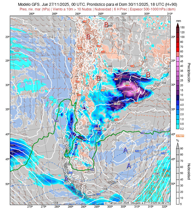 Presentan las Isobaras de la Carta de Superficie (con isobaras trazadas cada 2 hPa),  la Carta de Espesores 500/1000 hPa, algunos vientos ploteados, áreas de Lluvias y de Nubosidad previstas.