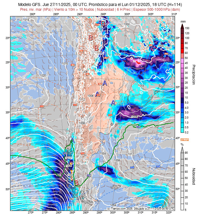Presentan las Isobaras de la Carta de Superficie (con isobaras trazadas cada 2 hPa),  la Carta de Espesores 500/1000 hPa, algunos vientos ploteados, áreas de Lluvias y de Nubosidad previstas.