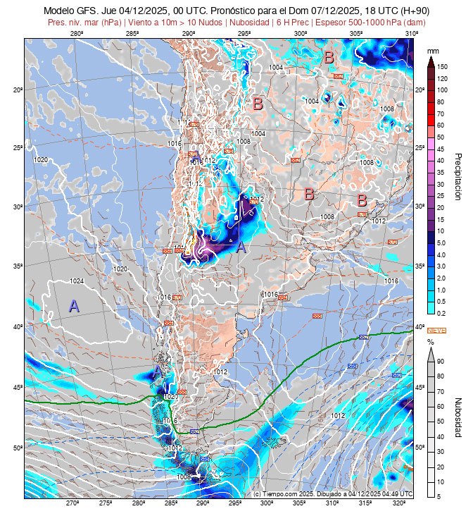 Presentan las Isobaras de la Carta de Superficie (con isobaras trazadas cada 2 hPa),  la Carta de Espesores 500/1000 hPa, algunos vientos ploteados, áreas de Lluvias y de Nubosidad previstas.