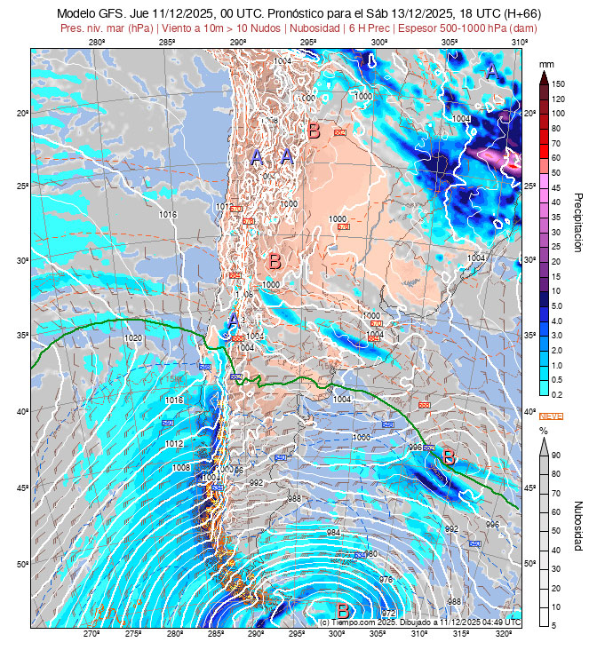 Presentan las Isobaras de la Carta de Superficie (con isobaras trazadas cada 2 hPa),  la Carta de Espesores 500/1000 hPa, algunos vientos ploteados, áreas de Lluvias y de Nubosidad previstas.