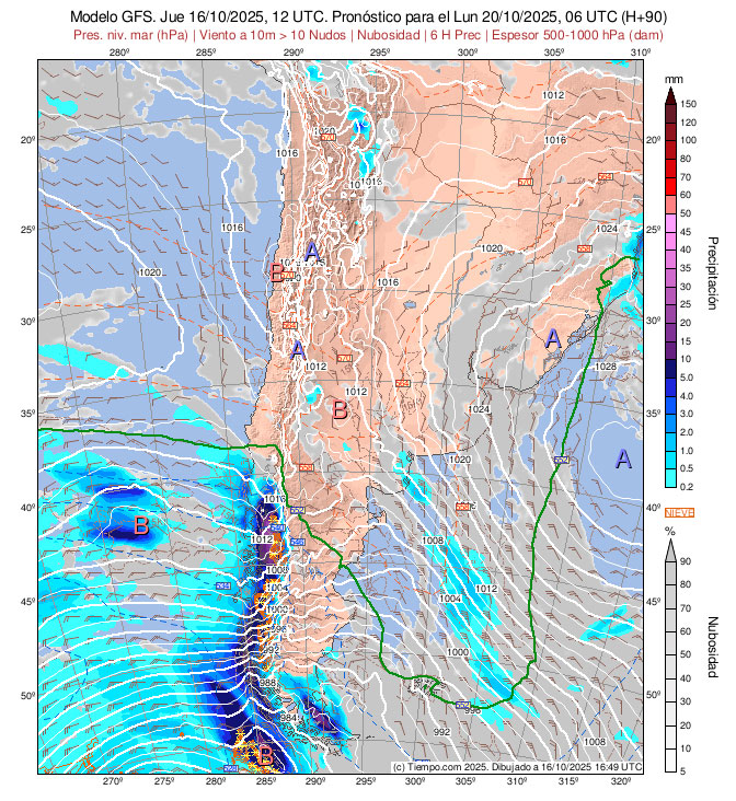 Presentan las Isobaras de la Carta de Superficie (con isobaras trazadas cada 2 hPa),  la Carta de Espesores 500/1000 hPa, algunos vientos ploteados, áreas de Lluvias y de Nubosidad previstas.