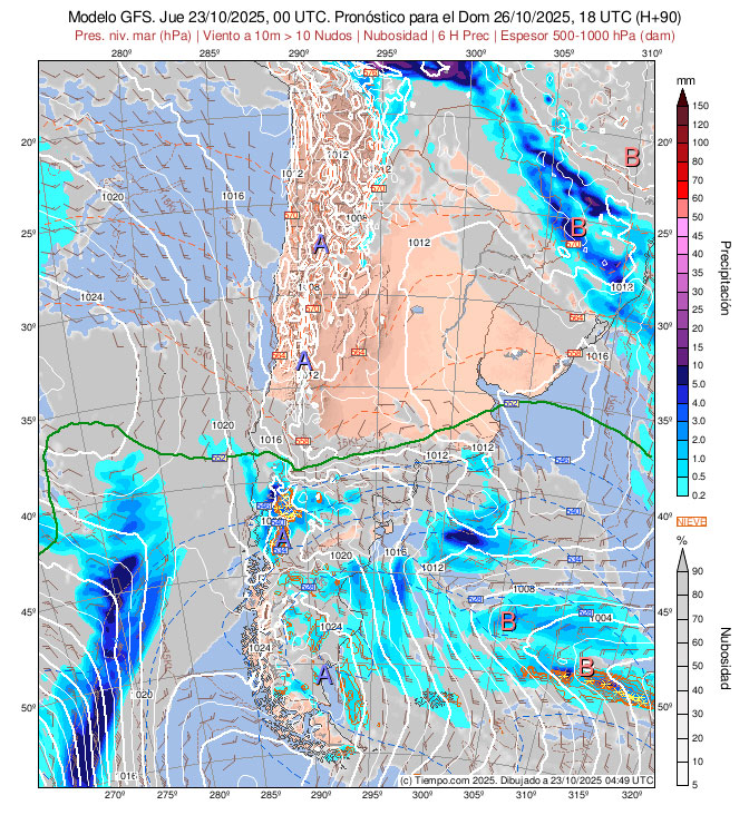 Presentan las Isobaras de la Carta de Superficie (con isobaras trazadas cada 2 hPa),  la Carta de Espesores 500/1000 hPa, algunos vientos ploteados, áreas de Lluvias y de Nubosidad previstas.